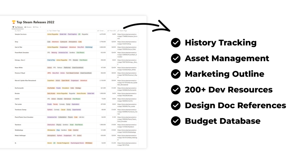 A comprehensive Notion dashboard that helps game developers, design, organize, and grow successful games.
